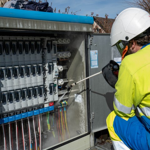 In Trafo-Stationen und Verteilerkabinen fliesst hohe elektrische Spannung. Schmutzablagerungen oder Feuchtigkeit können zu Kurzschlüssen, Lichtbögen oder anderen gefährlichen Zuständen führen, die Unfälle, Brände oder sogar explosionsartige Situationen verursachen könnten. Eine regelmässige Reinigung reduziert diese Risiken erheblich.